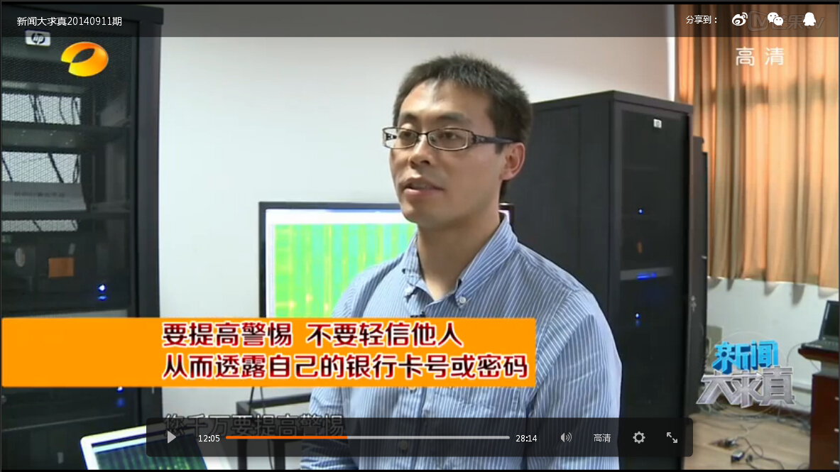 2014年9月11日,杨超现身湖南卫视科学类新闻栏目《新闻大求真》,科普了音频分析软件的原理,从而揭示了不法分子通过手机或电脑上数字按键语音盗取用户隐秘信息的手段,并详细说明了相关防范措施。
