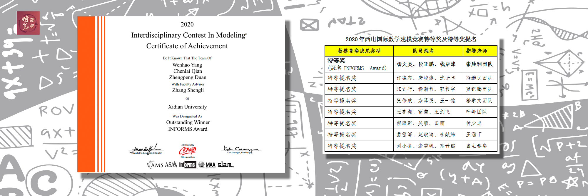 近日,2020年国际大学生数学建模竞赛成绩公布,beat365在线唯一官网获得INFORMS Award特等奖(Outstanding)1项、特等提名奖(Finalist)7项。这是学校继2014、2015和2018三度获得特等奖后,第四次获得该项目特等奖并且首次获得INFORMS Award冠名奖(The Institute for Operations Research and the Management Sciences,国际运筹学与管理科学学会会奖)。数模竞赛成绩的取得离不开全体教练的辛勤指导,也是学校各级领导关爱支持、处院各单位(数统院、计算机中心、教务处、后勤处、信息化处、各书院、相关学院)大力支持的结果。数学建模基地将继续为学校的一流建设和强化学生能力培养做出贡献。