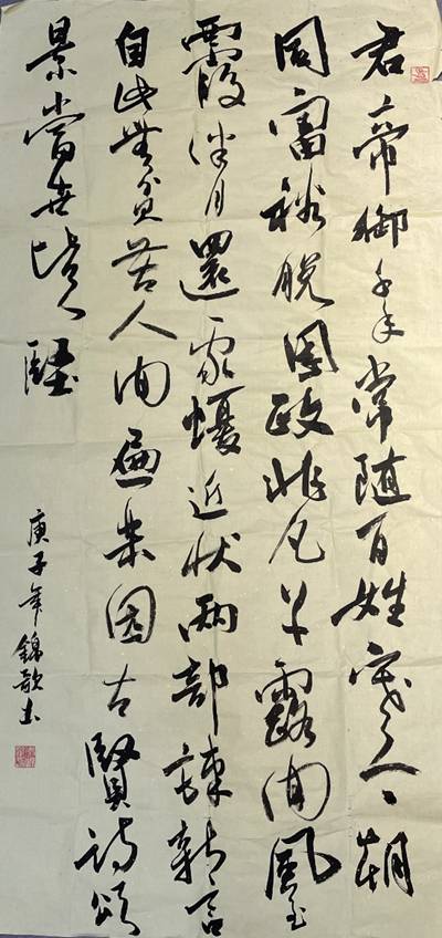 创作说明:行草作品,创作于2020年4月,庚子新至,本应万家灯火,又奈何天降大祸。抗疫战士响应党中央号召舍小家为大家,秉持人类命运共同体观念,合力抗疫,取得了武汉保卫战和湖北保卫战的决定性胜利。此作品多用米芾笔意,整饬且不失灵活,浓淡与粗细搭配有致符合创作主题。之所以选用行草而不是碑或者楷那样给人以''庄重''的字体,是因为想给观者传达一种从绝望看到希望,从短暂看到永恒的理念。
