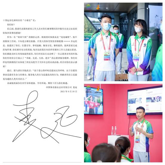 “作为一名‘初来乍到’的摄影记者,刚来的时候我真是处处碰壁,找不到媒体工作间、不知道去哪里拍摄,在偌大的体育馆里徘徊犹豫……幸运的是,我遇到了你们,位置引导、事项提醒、餐食分发、赛程提供,我所需要完成的每件事,你们都有充分的预案,每次包括我在内的所有媒体工作人员提出需求,你们都能及时且有效地提供服务。”中国体育报业总社记者麦延在给羽毛球“小秦宝”的信中,为志愿者细致周到的工作点赞。