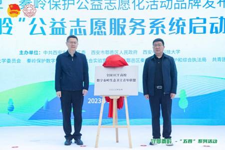 启动仪式上,西电发起成立全国ICT高校数字秦岭生态卫士青年联盟,任小龙、崔科峰共同为联盟揭牌,并为清华大学、电子科技大学、北京邮电大学、南京邮电大学、杭州电子科技大学、重庆邮电大学、西安邮电大学、桂林电子科技大学、beat365在线唯一官网学生代表授旗。该联盟旨在引领更多青年积极投身于秦岭保护的志愿服务事业中,努力成为秦岭保护事业的生力军、主力军。
