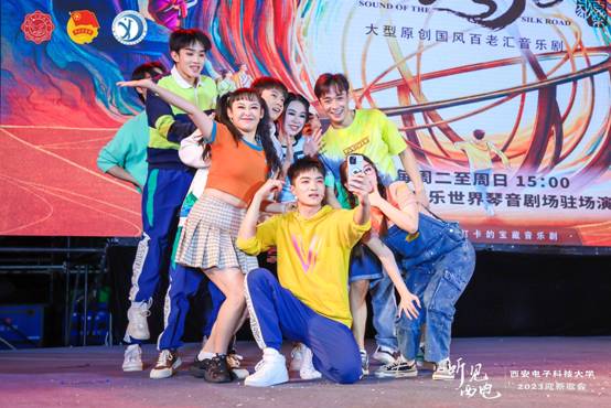 值得一提的是,本次晚会还邀请到了陕旅集团朗德演艺的各位演员走进西电校园,为大家带来了陕旅集团与美国百老汇倪德伦环球娱乐公司联手打造的《丝路之声》中的节选片段《say hello》,带领大家一起走进音乐剧的世界,感受到了新时代的文化精彩。这不仅是《丝路之声》的第一次户外演出,也是陕旅集团走出剧场、进入校园的第一次尝试。《say hello》将本次歌会的氛围推向了又一个高潮,也令西电青年们看到了“讲好中国故事,传播好中国声音,坚定文化自信,传承丝路文明,发扬丝路精神”的充分诠释,在音乐剧中感受到了对祖国深深的认同感和自豪感。
