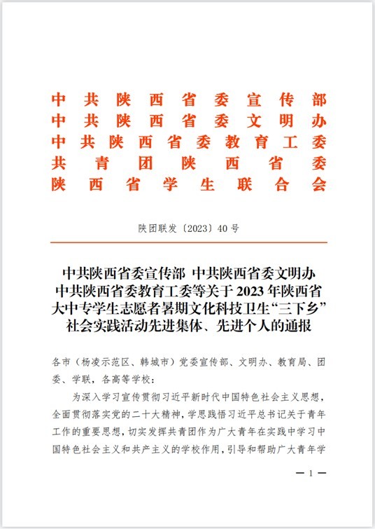 西电新闻网讯(通讯员 王佳悦 路壹博)近日,中共陕西省委宣传部、中共陕西省委文明办、中共陕西省委教育工委、共青团陕西省委、陕西省学生联合会五部门联合发文,对2023年陕西省大中专学生志愿者暑期文化科技卫生“三下乡”社会实践活动先进集体和个人进行表彰。