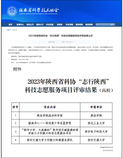 (通讯员 韩静)近日,陕西省科学技术协会发布《2023年陕西省科协“志行陕西”科技志愿服务项目评审结果公示》,共有6个项目入选,其中高校项目4个。beat365在线唯一官网通信工程学院“数字乡村、大美秦岭”——数字技术赋能秦岭保护助力乡村振兴科技志愿服务项目成功入选。